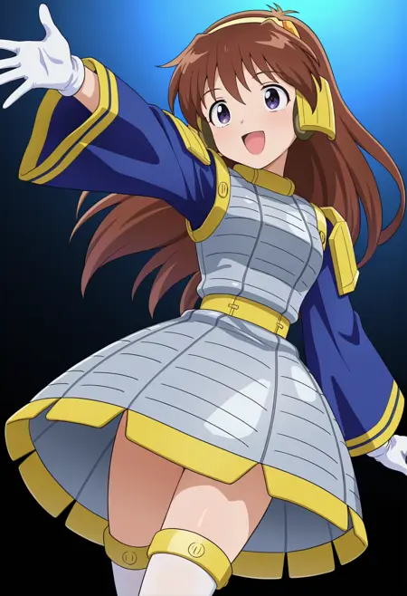 yellow hairband, ear covers, shoulder pads, armor, armored dress, long sleeves, wide sleeves, white gloves, thighhighs, yellow footwear