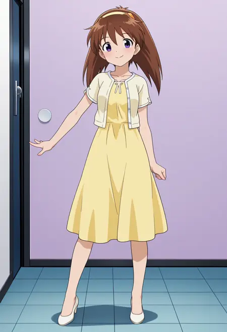 hairband, yellow cardigan, open cardigan, yellow dress, short sleeves, white pumps