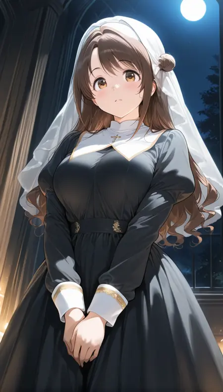 long sleeves, dress, puffy sleeves, black dress, wavy hair, juliet sleeves, veil, nun, habit, traditional nun,