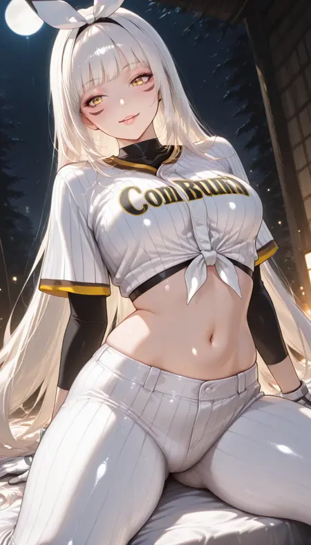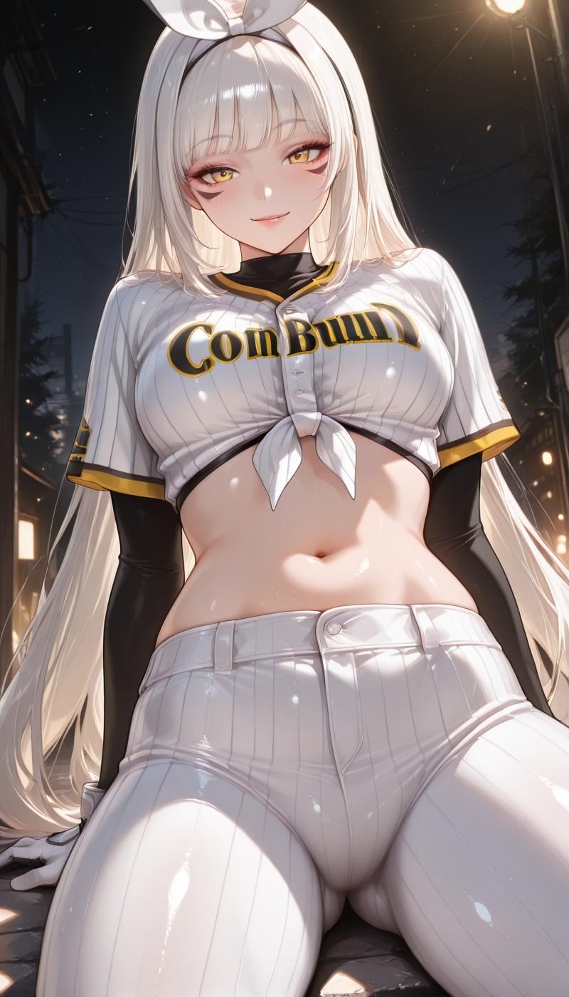 shirt, long sleeves, gloves, navel, ribbon, white shirt, hair ribbon, short sleeves, hairband, black gloves, pants, midriff, white gloves, eyelashes, black hairband, white ribbon, white pants, sportswear, tied shirt, baseball uniform, bow, very long hair, striped clothes, crop top, vertical-striped clothes, thighs, stomach, ass visible through thighs, tight clothes, cropped shirt, leggings, tight pants, facial mark,