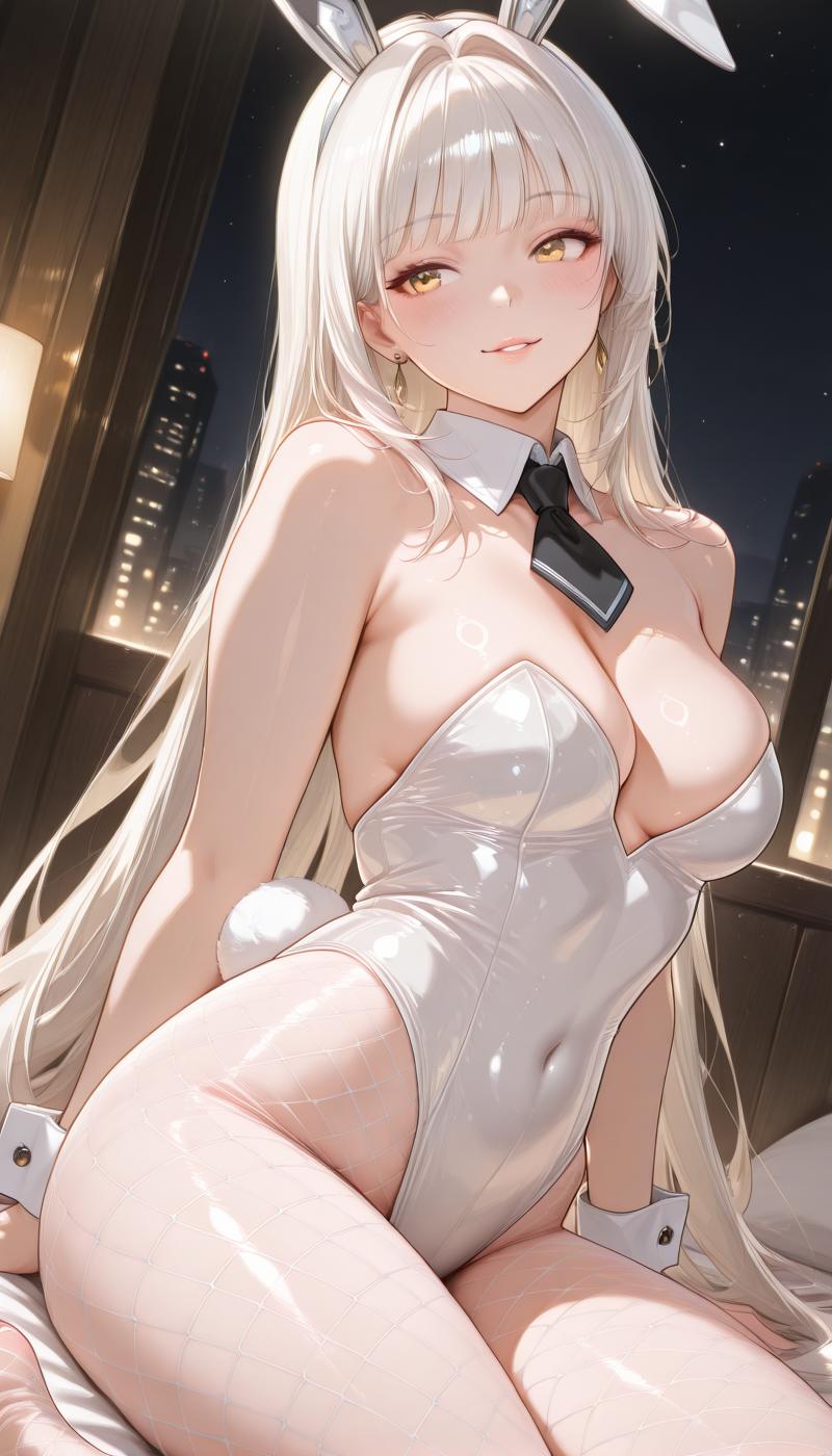 animal ears, cleavage, jewelry, bare shoulders, very long hair, collarbone, tail, thighs, pantyhose, earrings, necktie, rabbit ears, leotard, collar, wrist cuffs, strapless, fake animal ears, covered navel, detached collar, highleg, playboy bunny, hair intakes, rabbit tail, fishnets, strapless leotard, black necktie, highleg leotard, white pantyhose, fake tail, white leotard, fishnet pantyhose, white collar, short necktie, white wrist cuffs,