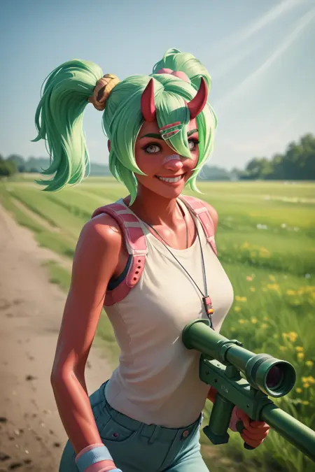 I’m rockin’ that gyaru vibe with my neon teal twintails, red oni horns, and a whole lotta crimson confidence. My style? Total Kogal Gyaru realness—think pink bat as an exclamation point, kappa backpack stuffed with snacks and chaos, and a retro cellphone charm danglin’ from my neck. I’m all about that 90s anime aesthetic, with tiger-striped leg warmers, hair clips galore, and a nose bandaid for that extra edge.
