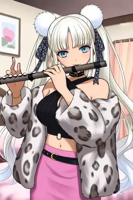 트리거 단어: Todoroki Kyoko, 애니메이션 스타일 소녀. 이미지는 긴 흐르는 흰색 머리카락을 트윈테일로 묶고 끝부분에 푹신한 흰색 덩어리가 있는 애니메이션 스타일 캐릭터를 특징으로 합니다. 캐릭터는 연한 파란색 눈을 가지고 있으며, 얇은 스트랩과 목에 초커가 있는 검은 상의를 입고 있습니다. 옷은 몸의 대부분을 덮는 흰색 털 같은 옷, 표범 무늬 코트, 그리고 검은 벨트가 있는 분홍색 치마로 구성되어 있으며, 푹신한 외관을 줍니다.