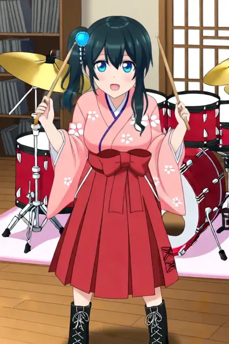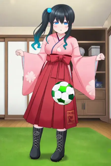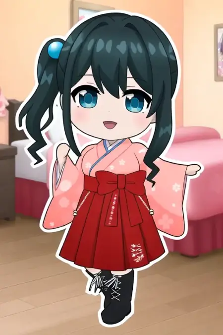 サンプルプロンプト: Oomachi Haruka, anime-style girl. The image features an anime-style character with long black hair styled in side ponytails, each adorned with a blue hair accessory. The character has striking blue eyes and is wearing a traditional Japanese kimono. The kimono is primarily pink with white floral patterns and a large red bow at the front. She is also wearing black lace-up boots. (she is dancing:2.5), (chibi Nendoroid:3.5) in bedroom.