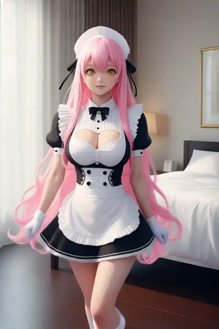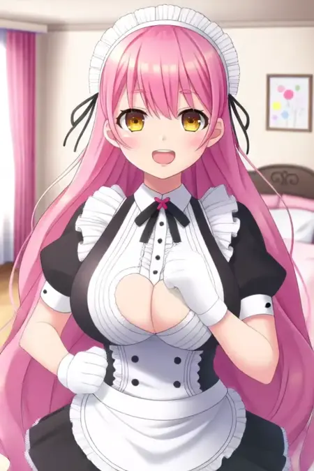 トリガーワード:Aizono Manami、アニメスタイルの女の子。画像には、肩より長い流れ込むピンク色の髪を持つアニメスタイルのキャラクターが描かれています。髪はゆるやかなウェーブでスタイリングされ、柔らかくボリュームのある外観を呈しています。キャラクターは大きく表現力豊かな黄色の目を持ち、目は大きく開いており、かわいらしく無垢な印象を強めています。キャラクターはメイド服を着ており、黒縁の白いエプロン、黒ボタンの白いブラウス、上にリボンがついた白い帽子が含まれています。服は白い手袋と黒いドット模様の白いスカートで完成しています。また、キャラクターは白い手袋と黒い靴を履いています。