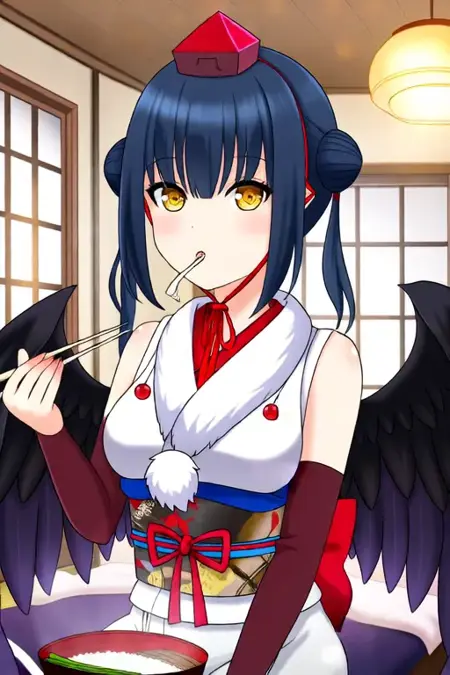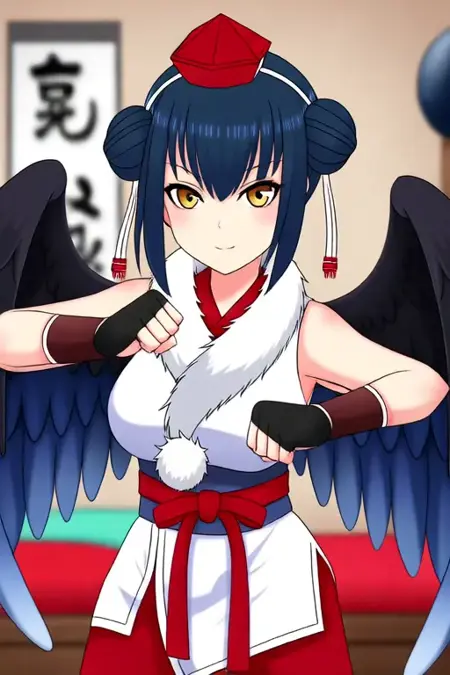 Trigger Word:Yamagami Karuta, anime-style girl. The image features an anime-style character with dark blue hair styled in two buns on either side of her head. She has golden eyes and is wearing a traditional Japanese outfit consisting of a white top with red accents and a red skirt. The outfit includes a red sash tied around her waist and a matching red hat with a red ribbon. The character has also white fur-like decorations on the collar and has large black wings extending from behind her back.