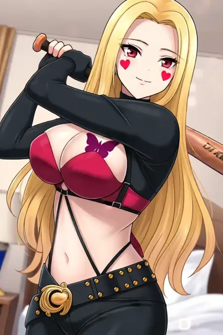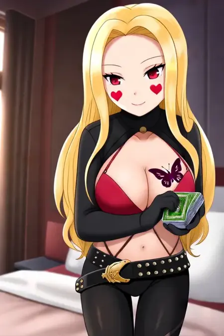 Trigger Word:Luis Cammy, anime-style girl. The image features a character with long, flowing blonde hair that cascades down past her shoulders. Her hair is styled in loose waves, giving it a natural and slightly tousled appearance. She has red heart-shaped stickers on her cheeks. Her eyes are a striking shade of red, which stands out prominently against her skin tone. The character's gaze is directed to the side, and she has a slight smile on her face, adding a hint of confidence or amusement to her expression.She is wearing a black outfit that includes a form-fitting top with a high neckline and thin straps. The outfit includes a red bra-like top with a butterfly tattoo on her chest. The character also wears black leggings that cover her legs completely, and a belt with a large, ornate buckle around her waist. The belt has multiple small, round studs attached to it, giving it a rugged and edgy look.