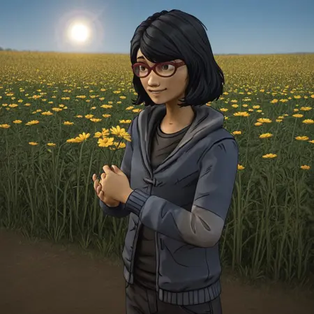 3D, Sarah, 1girl, alone, short shoulder-length black hair, red glasses, dark blue jacket with gray hood, undershirt, pants, dark brown boots