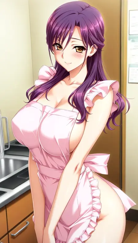 Fujimori Karin, violet hair, ponytail, short hair, pink bow, parted in middle, amber eyes