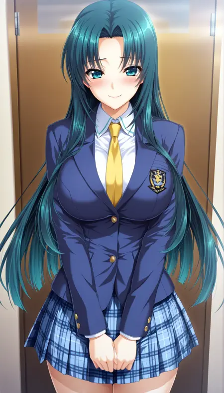 Minase Sayuri, teal hair, curtained, parted in middle, teal eyes