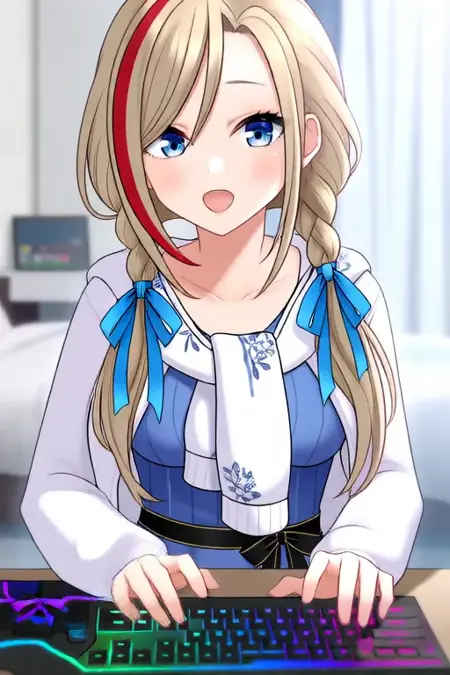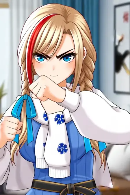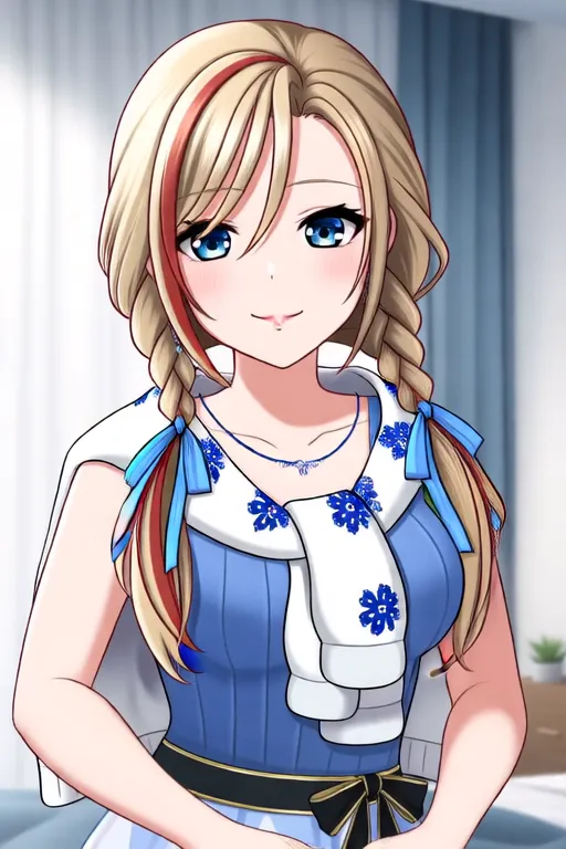 触发词:Kurusu Natsume,动漫风格女孩。图像呈现一位动漫风格的角色,拥有长发,编成两条辫子,发色为金色,带有浅棕与红色发丝点缀。角色拥有鲜明的蓝色眼睛,身着高领白色上衣,内搭蓝色连衣裙,腰间系有黑色腰带。颈部环绕一条白色围巾,饰有蓝色花卉图案。上衣的颈部与肩部系有蓝色丝带。