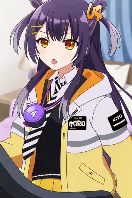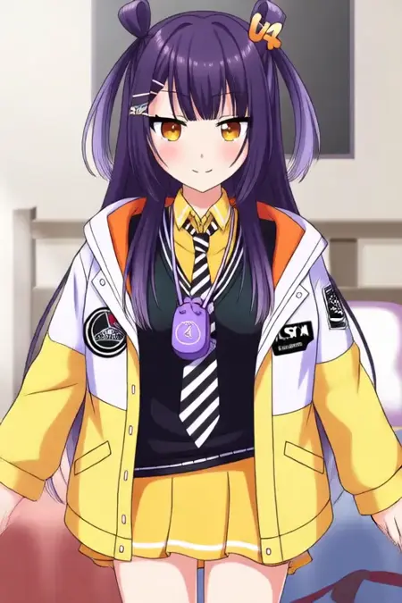 sample prompt:Umise Yotsuha, anime-style girl. The image features an anime-style character with long, dark purple hair styled in twin tails. The character has large, expressive orange eyes. They are wearing a white and yellow jacket with black accents, including a black shirt underneath. The jacket has a patch on the left side that reads "ASTRO" and another patch with the number "4". The character is also wearing a striped tie and a black vest over the shirt and yellow skirt. They have a small, purple accessory hanging from their neck, which appears to be a charm or pendant. (she is dancing:2.5), (chibi Nendoroid:3.5) in bedroom.