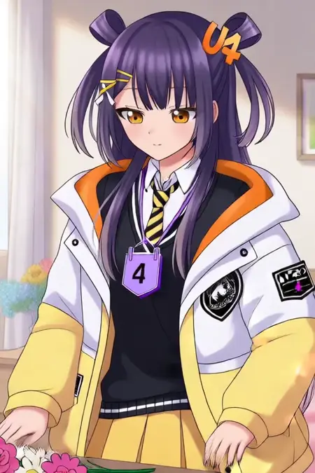 Trigger Word:Umise Yotsuha, anime-style girl. The image features an anime-style character with long, dark purple hair styled in twin tails. The character has large, expressive orange eyes. They are wearing a white and yellow jacket with black accents, including a black shirt underneath. The jacket has a patch on the left side that reads "ASTRO" and another patch with the number "4". The character is also wearing a striped tie and a black vest over the shirt and yellow skirt. They have a small, purple accessory hanging from their neck, which appears to be a charm or pendant.