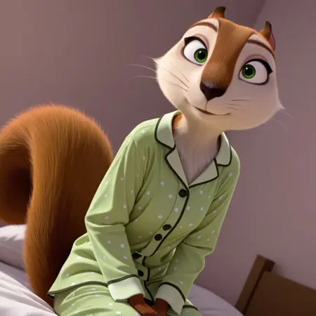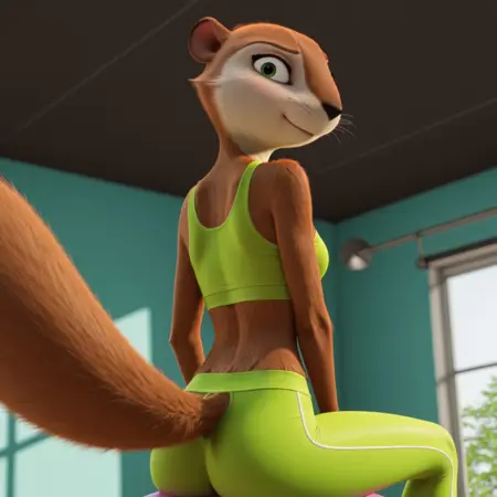 긍정적 프롬프트: AndieTNJ, 여성 퓨리, 야생, 설치류, 나무 다람쥐, 검은 코, 녹색 눈, 검은 동공, 갈색 몸통, 갈색 털, 흰색 털, 이색 몸통, 이색 털, 수염, 다람쥐 꼬리