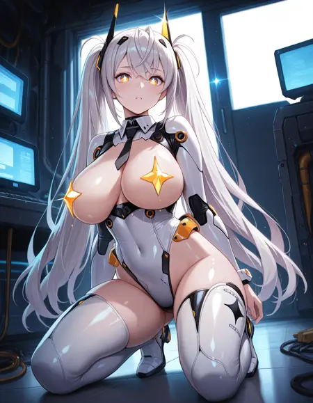 topless, thighs, glint, diffraction spikes, sparkle, sparkle over breasts, black tie, cleavage cutout, white leotard, highleg leotard, white bodysuit