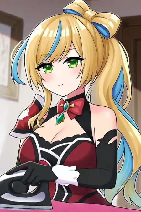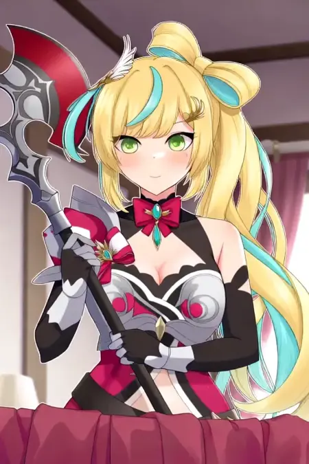 sample prompt:Tachitsute Toto, anime-style girl. The image features a character with long, flowing blonde hair adorned with blue streaks and a bow on top. The character has green eyes. The character's attire includes a black and red outfit with intricate designs. The top is a form-fitting dress with a high neckline, featuring a black bodice and red sleeves with white accents. A red bow with a green gemstone is tied around the neck, adding a touch of elegance to the ensemble. The character also wears black gloves with white cuffs, which complement the overall color scheme. They are holding a large axe with a red blade and a silver handle, which has blue gemstones attached to it. (she is dancing:2.5), (chibi Nendoroid:3.5) in bedroom.