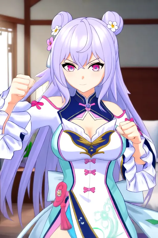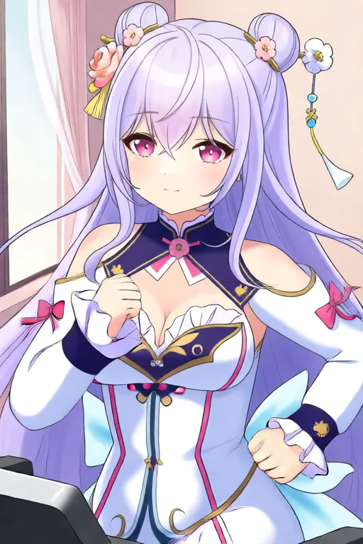 触发词:Kozue Mone,动漫风格女孩。图像呈现一位动漫风格的角色,拥有长而飘逸的薰衣草色长发,梳成两个发髻,点缀着小型花卉装饰。角色拥有醒目的粉色眼睛,身着细节丰富的服装,包括一件白色与蓝色相间的连衣裙,裙摆有荷叶边袖子和高领设计。裙子上有精致的金色刺绣和粉色点缀,包括胸前的蝴蝶结和背部相配的蝴蝶结、带有红色装饰的白色围裙,以及浅蓝色的裙摆。
