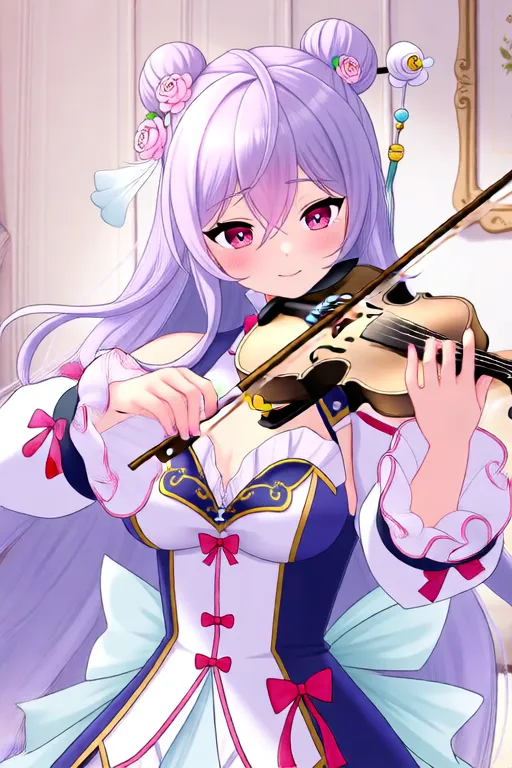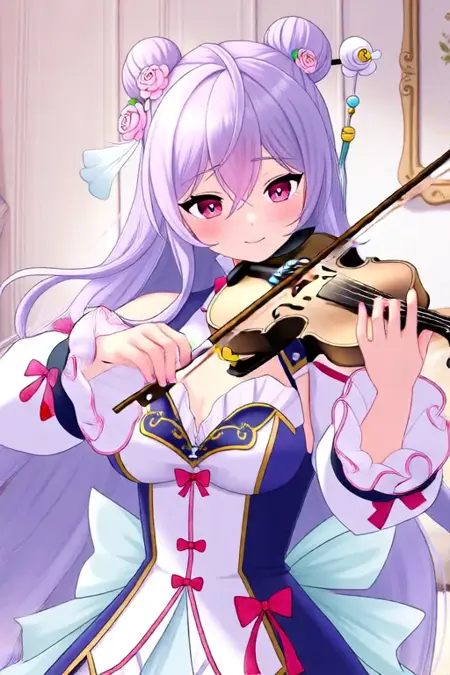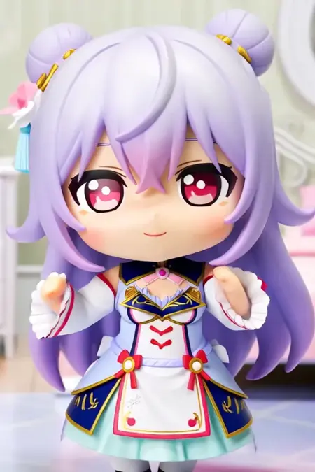 示例提示:Kozue Mone,动漫风格女孩。图像呈现一位动漫风格的角色,拥有长而飘逸的薰衣草色长发,梳成两个发髻,点缀着小型花卉装饰。角色拥有醒目的粉色眼睛,身着细节丰富的服装,包括一件白色与蓝色相间的连衣裙,裙摆有荷叶边袖子和高领设计。裙子上有精致的金色刺绣和粉色点缀,包括胸前的蝴蝶结和背部相配的蝴蝶结、带有红色装饰的白色围裙,以及浅蓝色的裙摆。 (她正在跳舞:2.5), (Q版Nendoroid:3.5) 在卧室中。