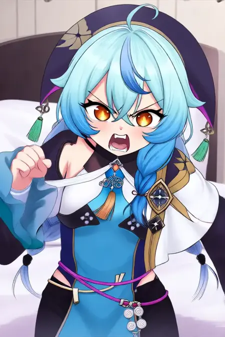示例提示:Tamanoi Nana,动漫风格女孩。图像呈现一位动漫风格的角色,拥有浅蓝色头发,编成两条辫子,发饰上点缀着小型装饰元素。角色拥有大而富有表现力的橙色眼睛,瞳孔为黑色。她穿着一套精致的服装,包括带有黑色装饰的白色上衣、蓝色裙子,以及各种配饰,如带有环扣的腰带和装饰性头饰。角色还佩戴着一条带有流苏的项链。(她正在跳舞:2.5),(Q版Nendoroid:3.5)在卧室中。