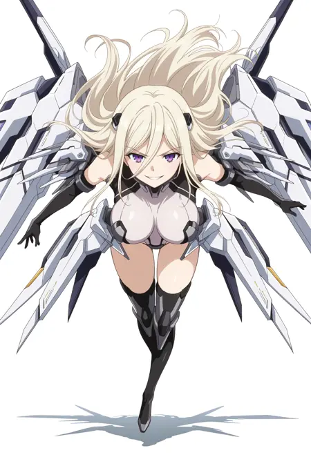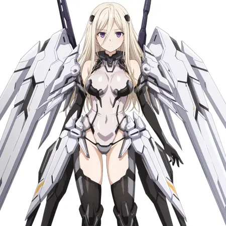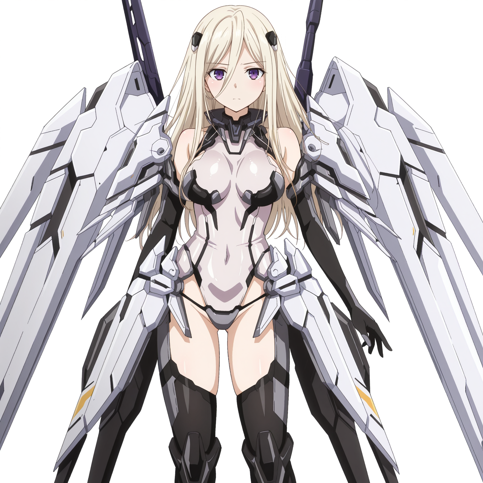 CRPendragon, mecha_musume, bare shoulders, hair ornament, bodysuit, armor, blue_elbow_gloves, black_gloves, mechanical_wings, thigh_boots, black_legwear,