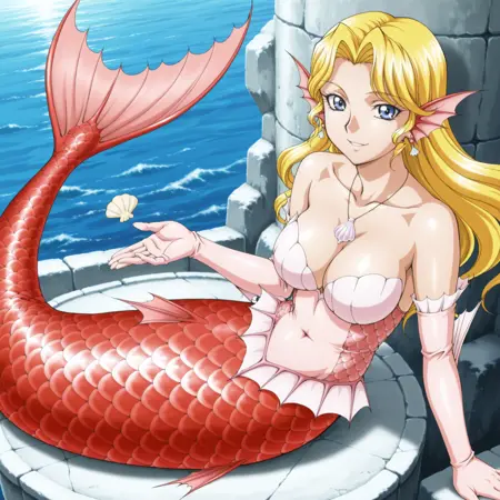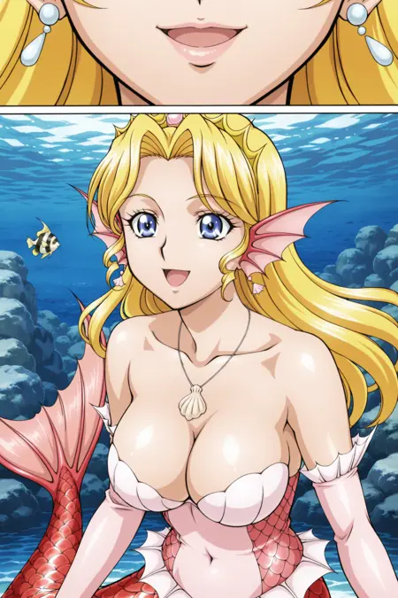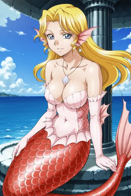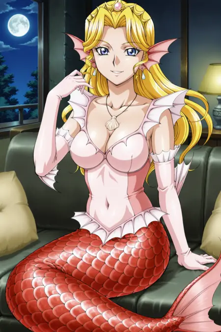 1girl, mature female, solo, mermaid, monster girl, yugioh_card_style, yugioh_card_for_cure_mermaid, blonde hair, long hair, blue eyes, earrings, seashell pendant, large breasts, smile, clevage, collarbone, covered navel, tiara, elbow gloves, pink fantasy dress, red scaled mermaid tail