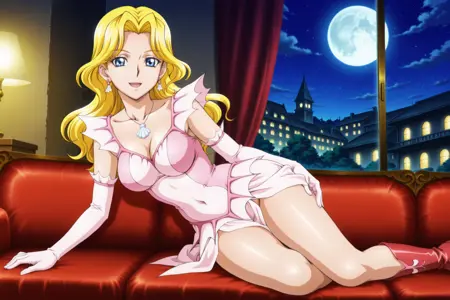 1girl, mature female, solo, yugioh_card_style, yugioh_card_for_cure_mermaid, blonde hair, long hair, blue eyes, earrings, seashell pendant, large breasts, smile, clevage, collarbone, covered navel, tiara, elbow gloves, pink fantasy dress, red boots
