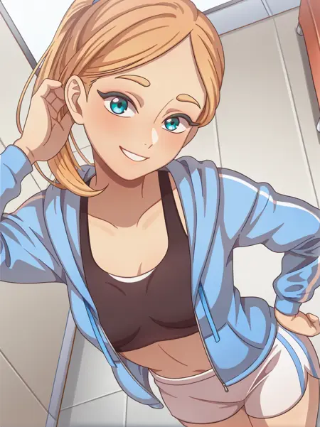 ADD: "blonde hair, long hair, blue eyes, ponytail, blue jacket, sports bra, white shorts"