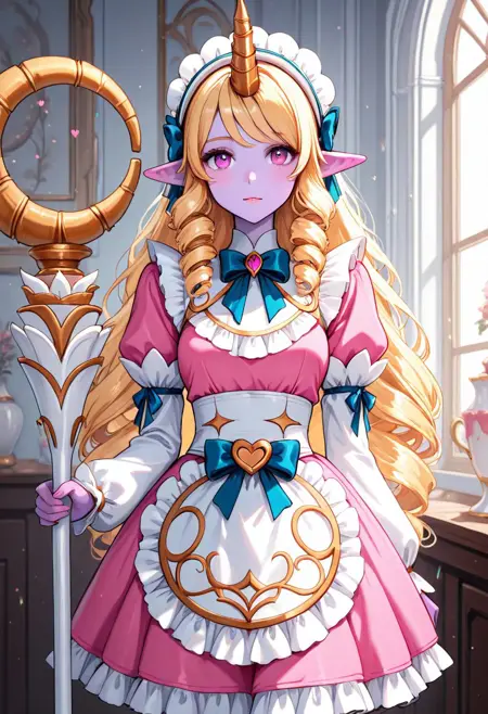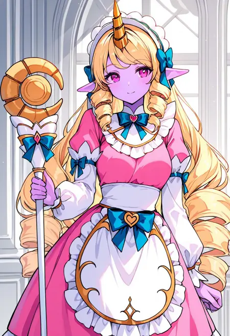 ccs01, purple skin, long blonde curly hair, single golden horn on forehead, elf ears, pink maid dress, white apron, big blue ribbon on chest, blue ribbons on sleeves and waist, heart-shaped gold ornament on apron, white puffy sleeves, white gloves, knee-length frilled skirt, white headdress, long white stockings, candy-shaped staff
