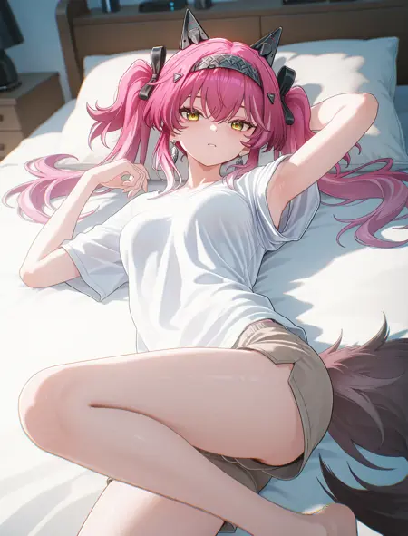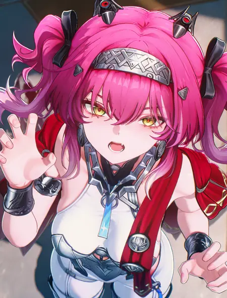 Lupa, pink hair, twintails, long hair, earrings, yellow eyes, hairband, red cape, armor, white bodysuit, sleeveless, high heel boots, wolf tails, masterpiece, best quality, amazing quality, very aesthetic, high resolution, ultra-detailed