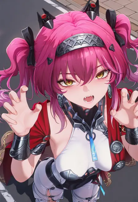 Lupa, pink hair, twintails, long hair, earrings, yellow eyes, hairband, red cape, armor, white bodysuit, sleeveless, high heel boots, wolf tails, masterpiece, best quality, amazing quality, very aesthetic, high resolution, ultra-detailed