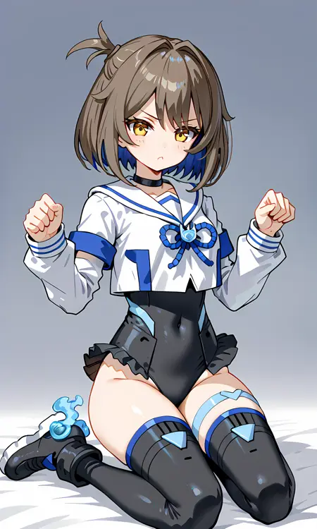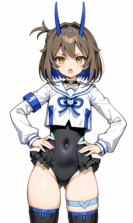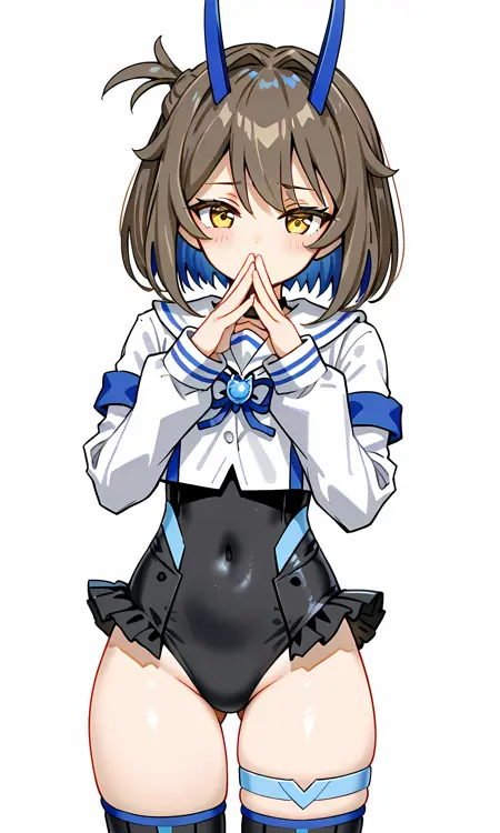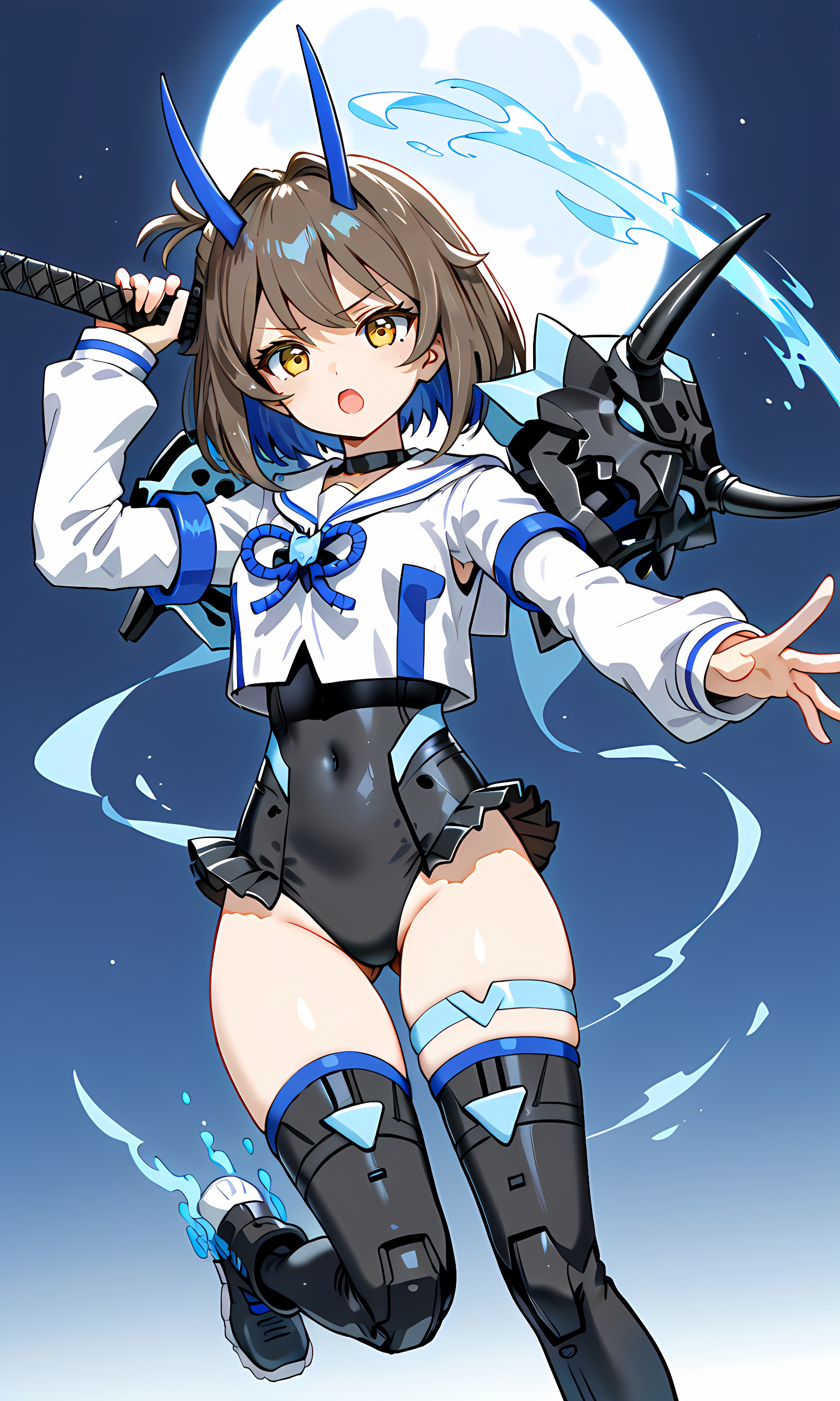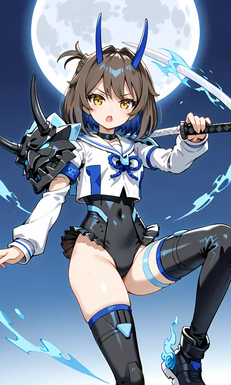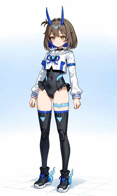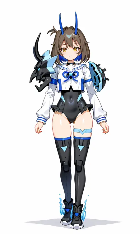 Armored Outfit 1: illustration, SIS-N00 Sourei, brown hair, blue inner hair, dual-tone hair, short hair, bob cut, ahoge on the right, blue horns, yellow eyes, black choker, white cropped jacket, blue accents on cropped jacket, blue ribbon bow on chest, white long sleeves, blue accents on long sleeves, partially exposed right arm, blue band on right arm, oni-style armor, horned shoulder armor, black shoulder armor on left arm, blue accents on shoulder armor, asymmetrical sleeve design, bare hands, black leotard, blue accents on leotard, bare thighs, blue accents on thighs, blue thigh straps on left thigh, black thigh-high armor, blue knee plates on thigh-high armor, black sneakers, ghost fire on sneakers