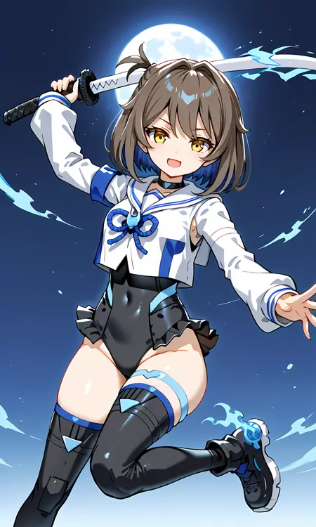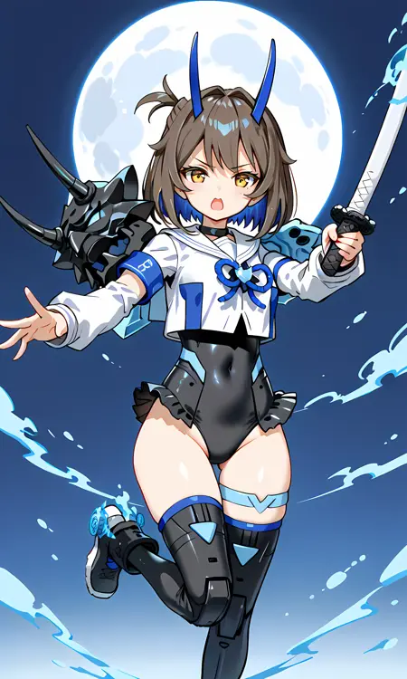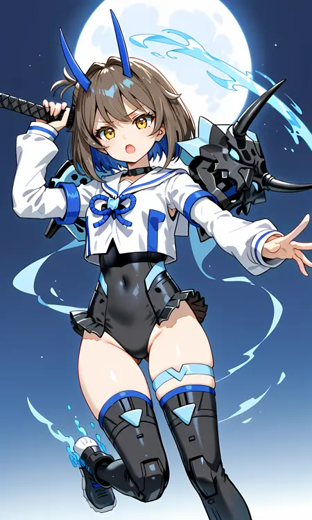 일반 갑옷: 일러스트, SIS-N00 Sourei, 갈색 머리카락, 파란색 안쪽 머리카락, 이톤 머리카락, 단발, 밥컷, 오른쪽에 아호게, 파란색 뿔, 노란색 눈, 검은색 목걸이, 흰색 짧은 재킷, 짧은 재킷에 파란색 액센트, 가슴에 파란색 리본 bow, 흰색 긴 소매, 긴 소매에 파란색 액센트, 오른쪽 팔 부분 노출, 오른쪽 팔에 파란색 밴드, 온이 스타일 갑옷, 뿔 달린 어깨 갑옷, 왼쪽 팔에 검은색 어깨 갑옷, 어깨 갑옷에 파란색 액센트, 비대칭 소매 디자인, 손은 벗은 상태, 검은색 레오타드, 레오타드에 파란색 액센트, 허벅지는 벗은 상태, 허벅지에 파란색 액센트, 왼쪽 허벅지에 파란색 허벅지 스트랩, 검은색 허벅지까지 오는 갑옷, 허벅지까지 오는 갑옷에 파란색 무릎 보호대, 검은색 스니커즈, 스니커즈에 유령 불꽃