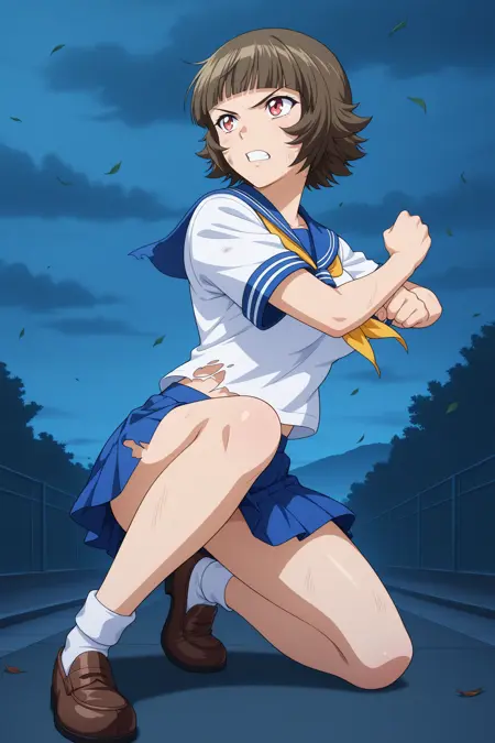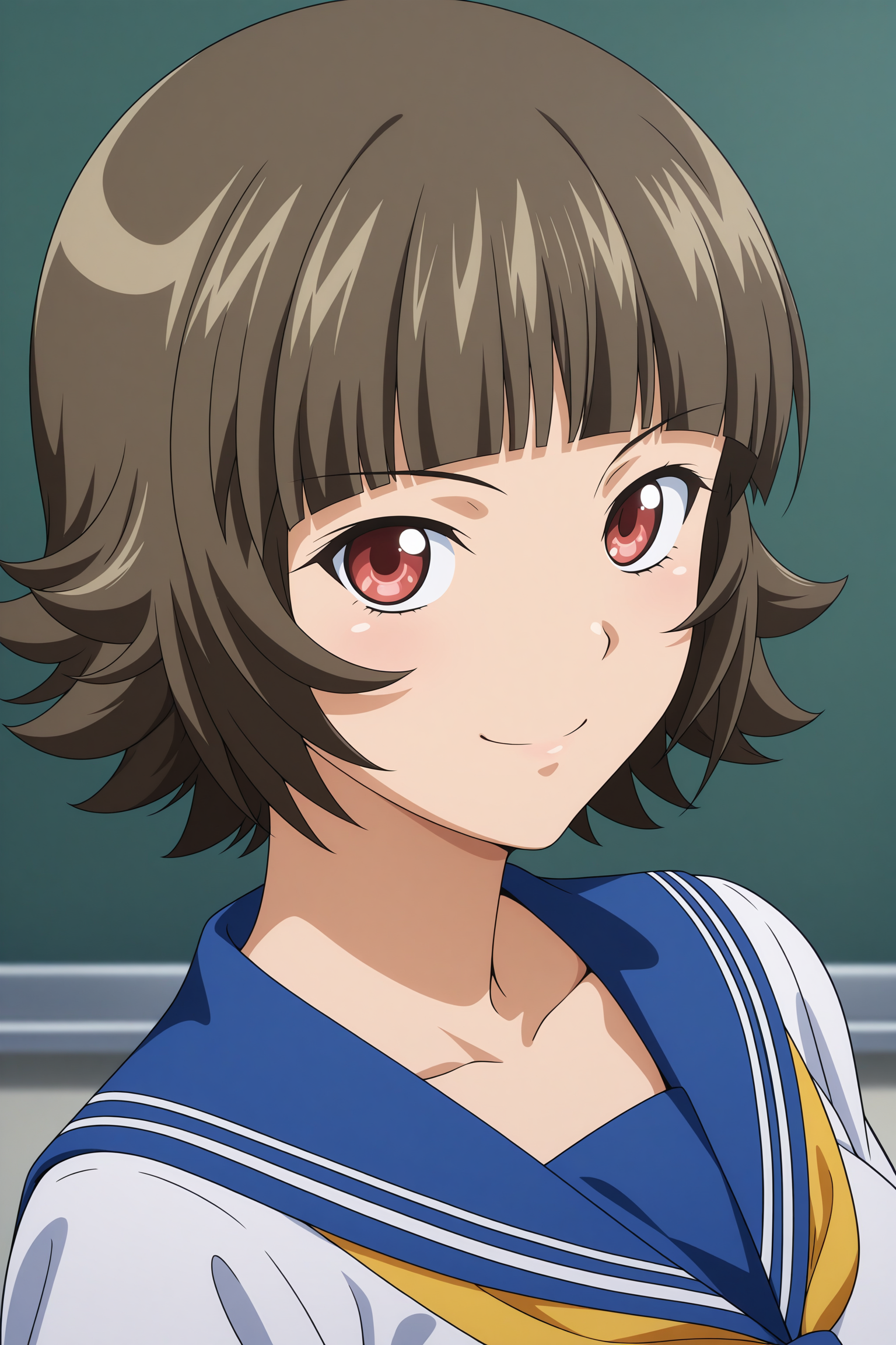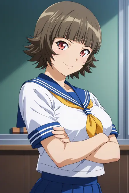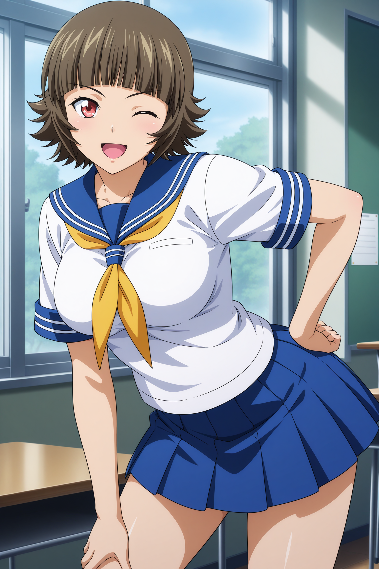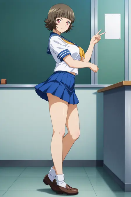 chouhi ekitoku, short hair, brown hair, blunt bangs, red eyes, short sleeves, white shirt, blue sailor collar, yellow neckerchief, blue skirt, pleated skirt, white socks, ankle socks, brown footwear, loafers
