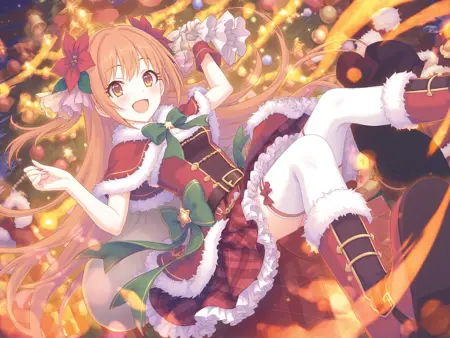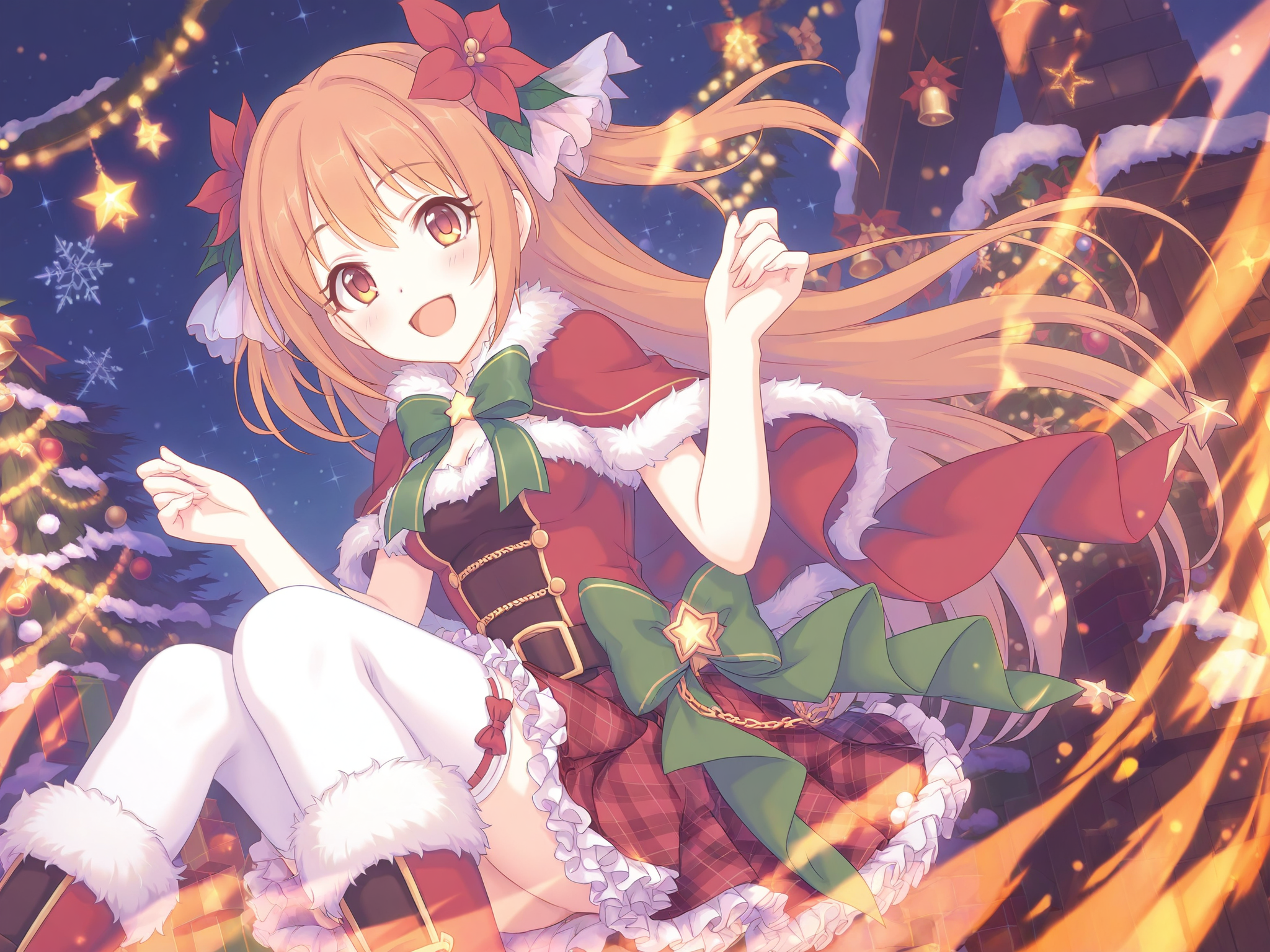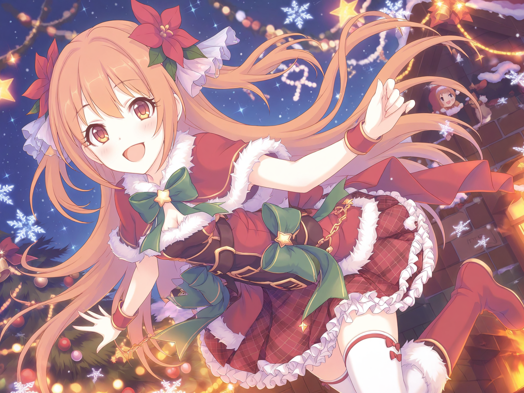 more details,incredibly absurdres,lora:Nozomi5464:0.9,Nozomi/(princess connect!),1girl,hair flower,thighhighs,red flower,fur-trimmed boots,fur trim,green bow,brown eyes,very long hair,white thighhighs,brown hair,plaid skirt,red dress,fur-trimmed dress,christmas,frilled skirt,fur collar,santa costume,green ribbon,