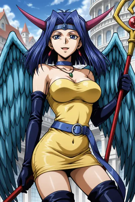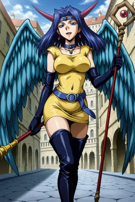 yugioh_card_style, yugioh_card_for_dark_witch, 青い髪, 青い目, ピアス, ネックレス, 大きな胸, 笑顔, 胸元, 鎖骨, 腹部カバー, 翼, 肘までグローブ, 角, 杖, 黄色いドレス, 青い腰ベルト, 杖, 太ももブーツ