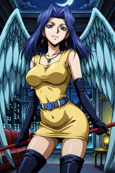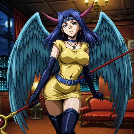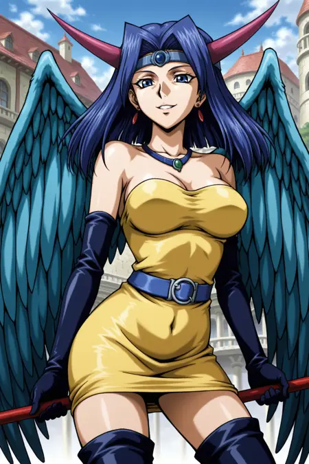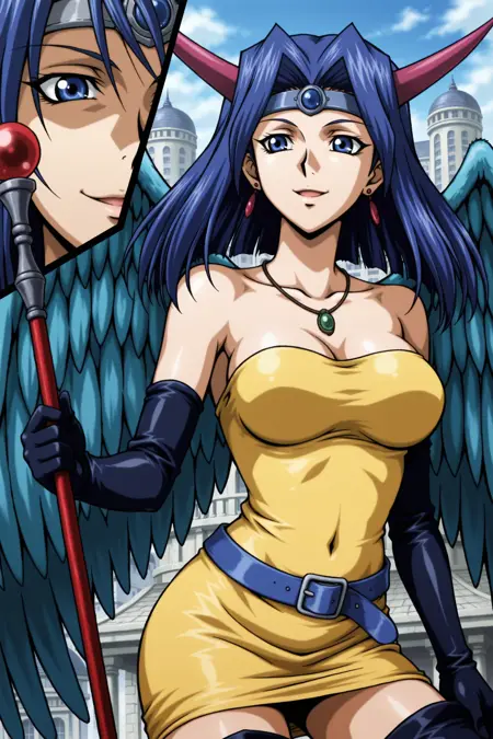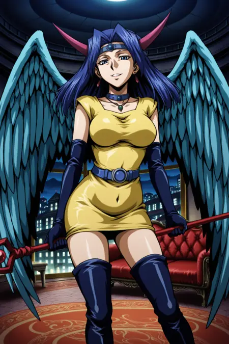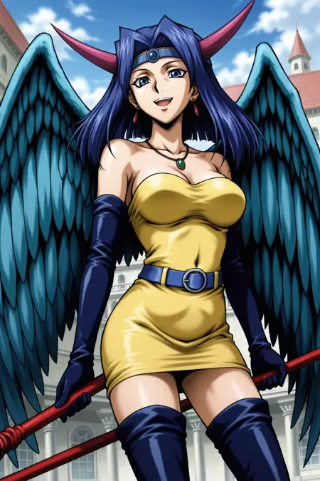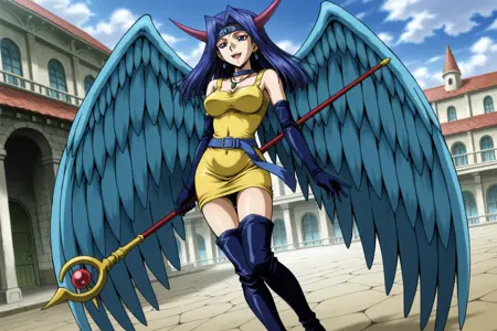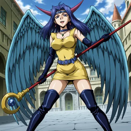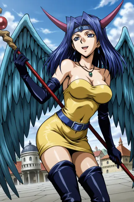 yugioh_card_style, yugioh_card_for_dark_witch, blue hair, blue eyes, earrings, necklace, large breasts, smile, clevage, collarbone, covered navel, wings, elbow gloves, horns, staff, yellow dress, blue waist belt, staff, thigh boots
