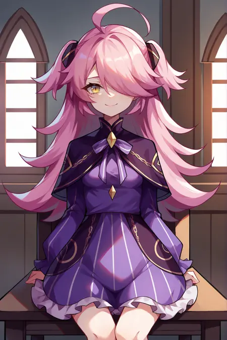 To trigger her Houkai Gakuen 2 Long Hair Version use gakuen alter, along with some other helpful tags such as: small breasts, purple dress, long hair, two tone hair, pink hair, capelet, petite, two side up, hair covering one eye, long sleeves. NOTE: if you want her long dress hair costume you have to reinforce it using the trigger word sin alter dress alongside gakuen alter, if want to change her clothes in this version you can omit the secondary trigger.
