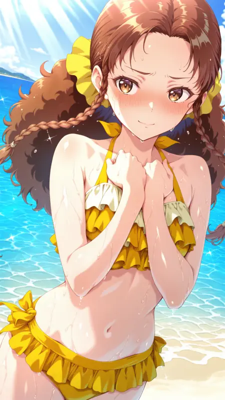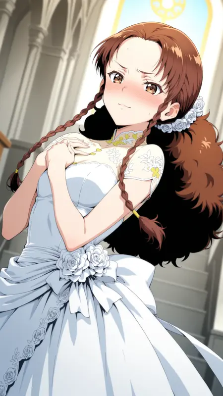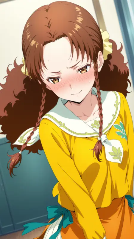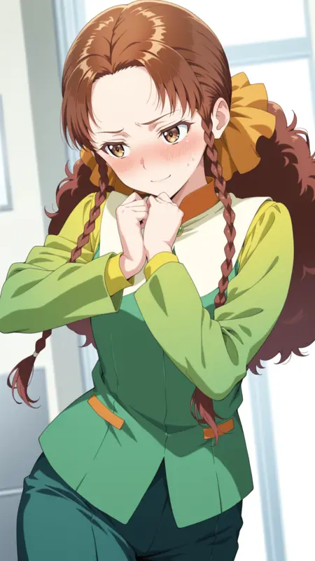 Appearance:brown eyes, brown hair, long hair, twin braids,