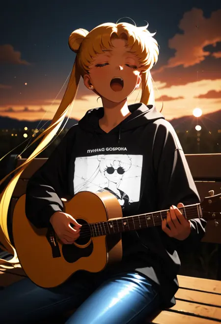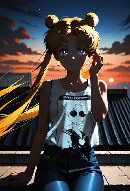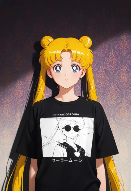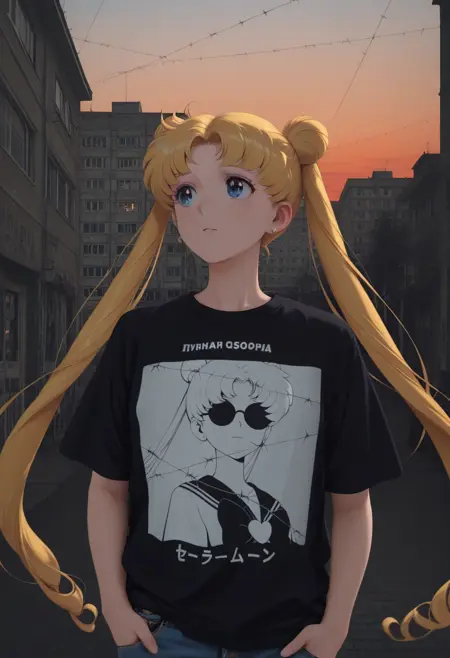 The print features Sailor Moon anime character Tsukino Usagi in the image of Yegor Letov - leader of the post-punk/psychedelic rock band Grazhdanskaya Oborona.