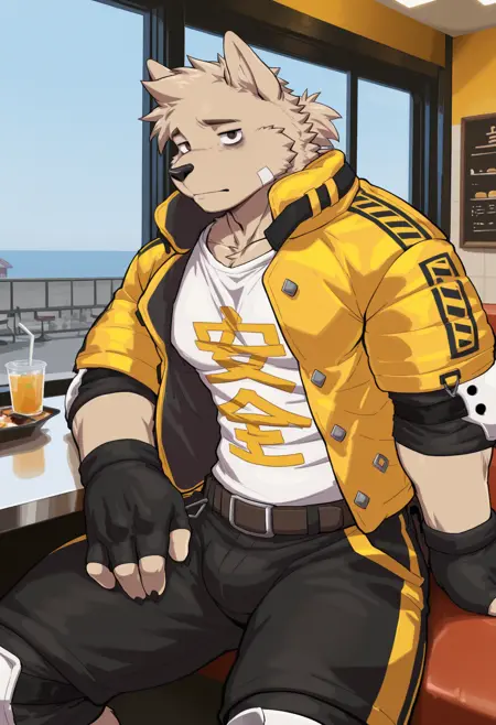 복장: 흰 셔츠, 노란 재킷, 검은 반바지, 갈색 벨트, 팔꿈치 패드, 손가락 없는 장갑