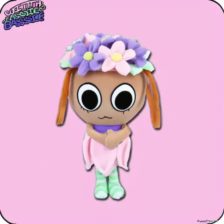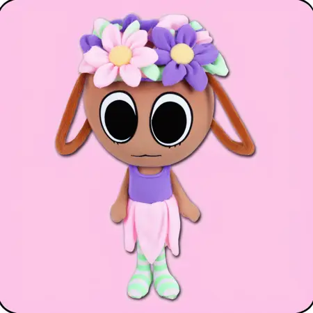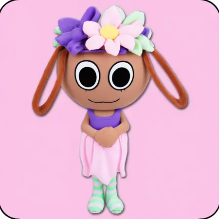 dandys world, dandy, cartoon,1girl, Bassie, Bassie Dandy's World, Brown Skin, Basket Head, Flowers inside of Basket Head, two Handles on the Sides of Basket Head, Purple Tank top, Pink Skirt, Green Striped Pantyhose