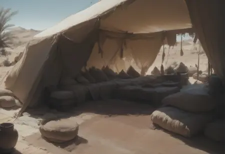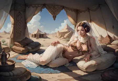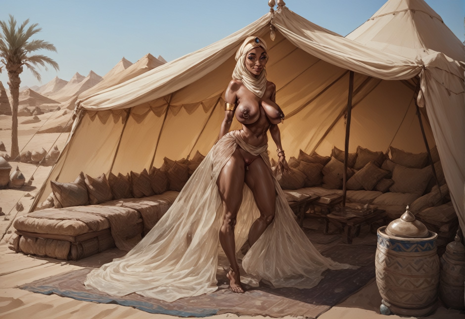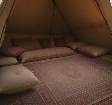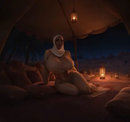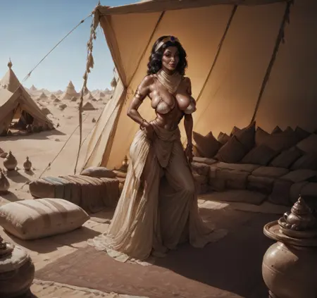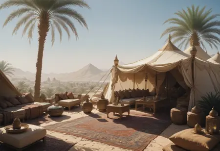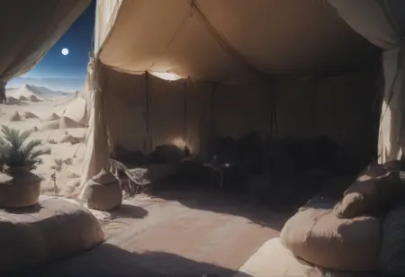 Tent is the main trigger, but others like inside a tent, outside a tent, outdoors, indoors, scenery, palm tree, cushions, desert and so on are useful. If background is a mass of tents, putting multiple tents in negative tends to help.
