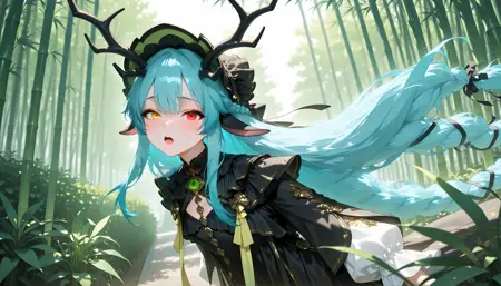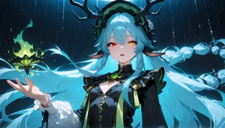 onlySania, blue hair , antlers,petite heterochromia, very long hair, braid,