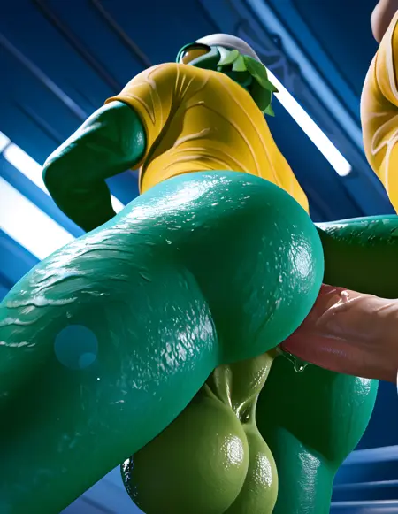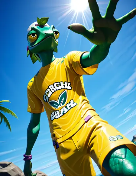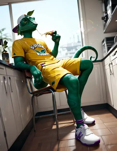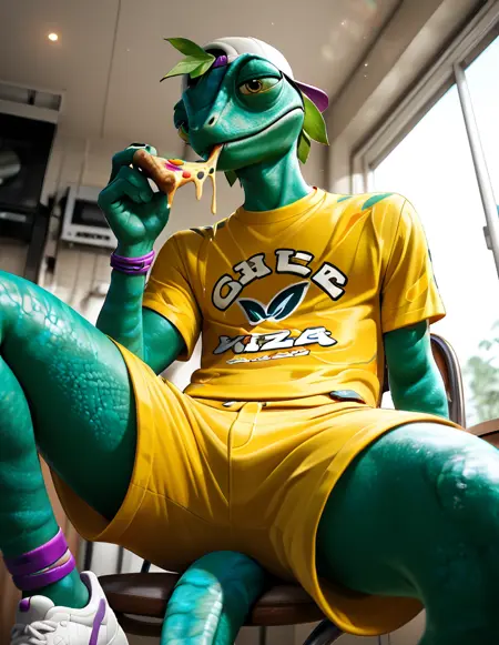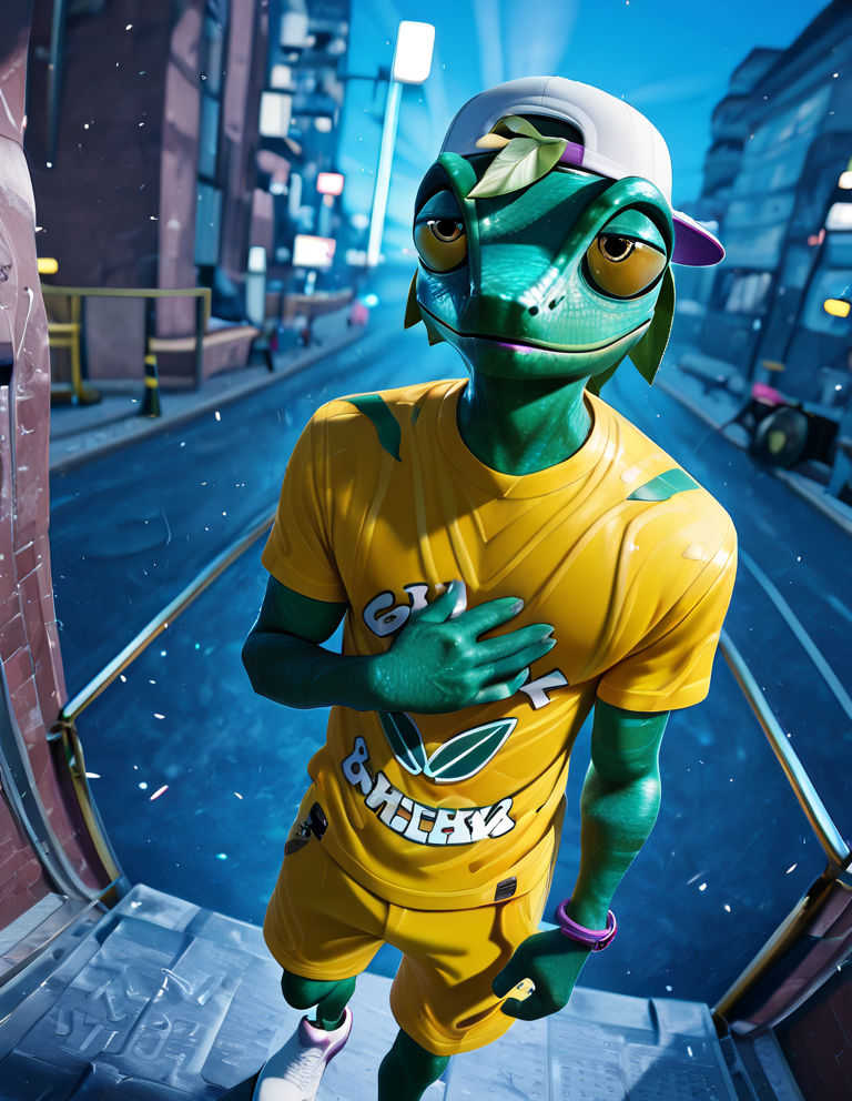 male, furry, geko, green skin, blue scales accents, green leaf hair, short hair, lighter palm hands, half closed eyes, yellow big eyes, white cap with purple brim accents, yellow shirt with logo, yellow shorts, purple wristbands, purple leg bands, white shoes with purple accents,