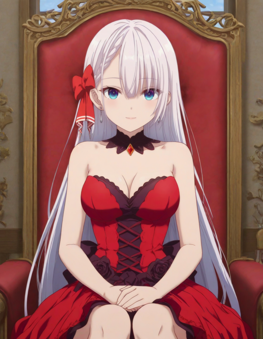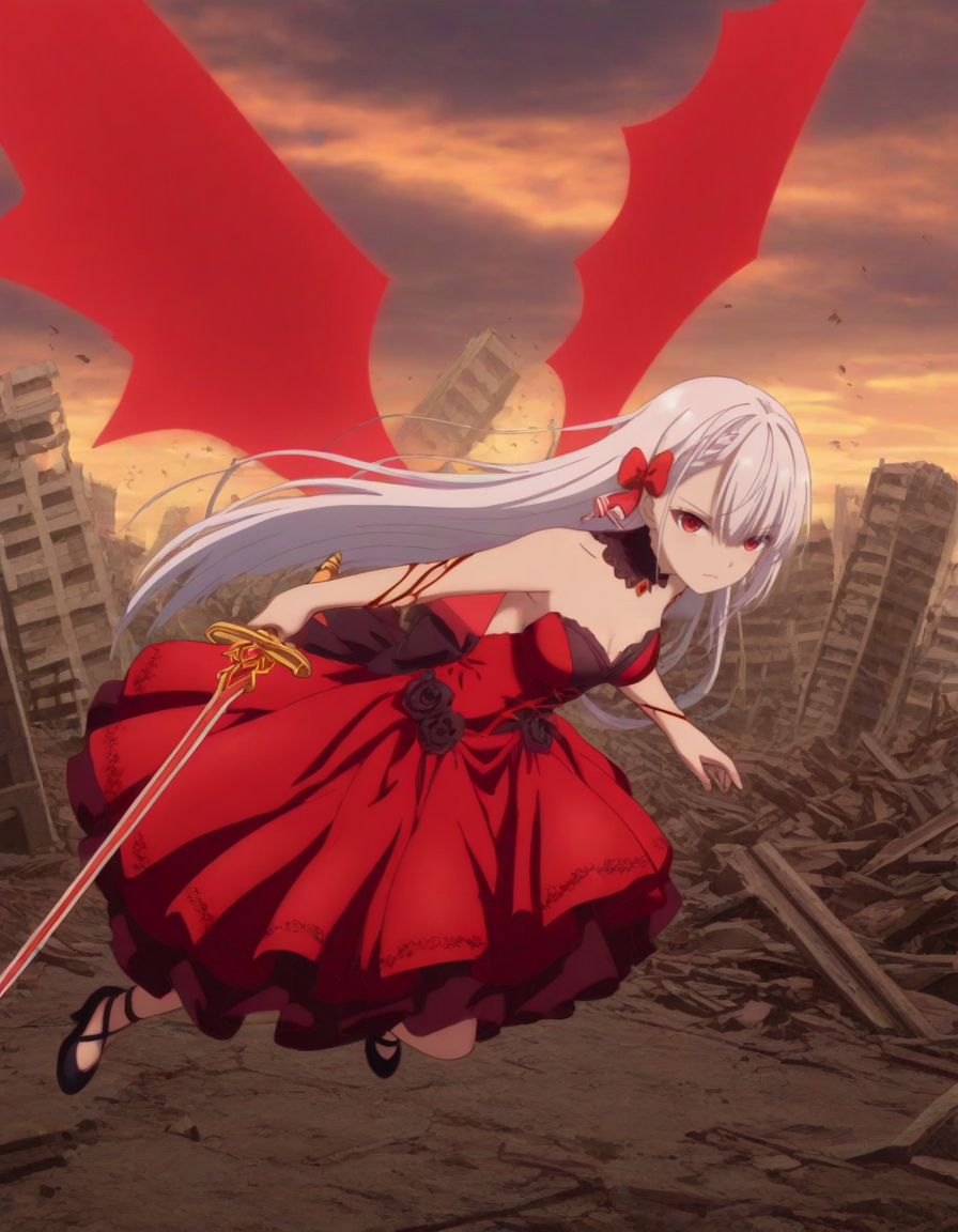 hair bow, red eyes, collarbone, cleavage, vampire queen outfit, black choker, red gem, red bat wings, red dress, backless dress, strapless dress, cross-laced dress, blood on arm, layered dress, black rose, back bow, black footwear