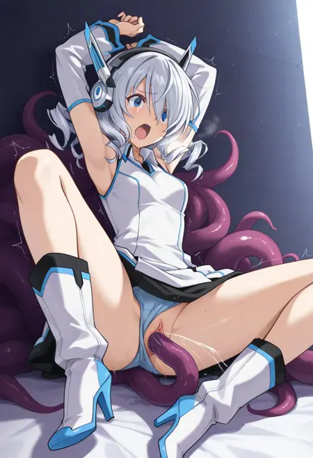 ENT_Girl,白发,蓝眼,中长发,卷发,头发遮住一只眼睛,ENT_裙装,ENT_耳机,高耸蓬松的领子带蓝色镶边,裸露肩膀,带蓝色镶边的分离式袖子,白色ENT制服带蓝色镶边,短裙,碟形裙摆,裸腿,高筒靴,