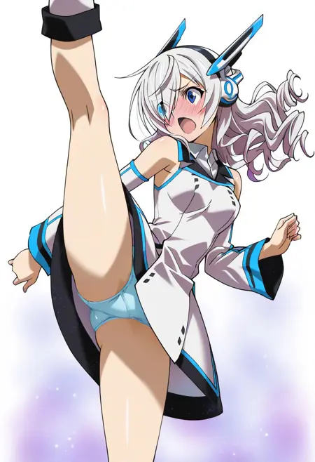 ENT_Girl,白发,蓝眼,中长发,卷发,头发遮住一只眼睛,ENT_裙装,带蓝色镶边的翻领,白色ENT制服带蓝色镶边,长袖,白色腰带,短裙,带蓝色镶边的短裙摆,白色大腿袜带蓝色镶边,