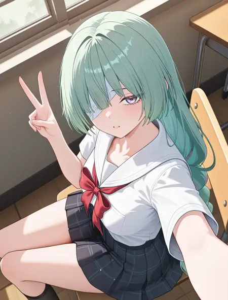Phrolova, green hair, long hair, grey eyes, bandage over one eye, dress, bandges, single detached sleeve,
