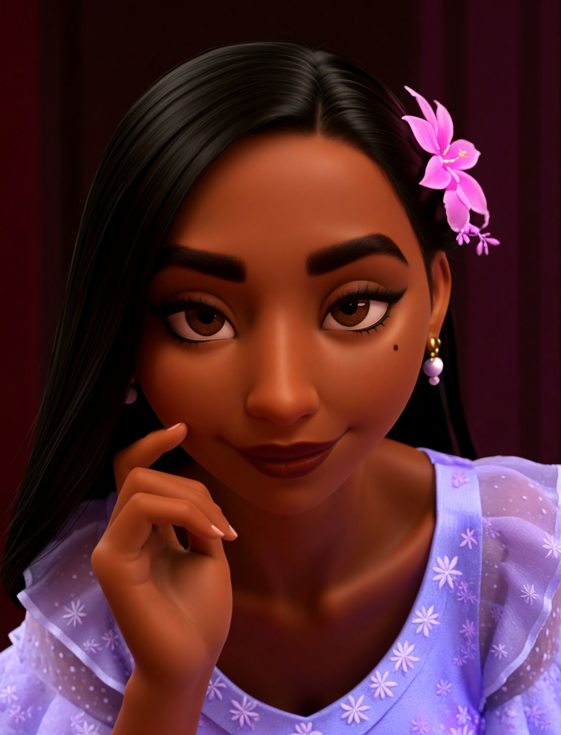 关键词: isabelamadr、深色皮肤女性、眼下有痣、棕色眼睛、长发、黑发、浓眉、耳环、发饰花、口红