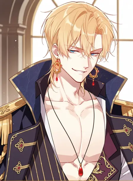 辅助词 - 金发,头发位于眼睛之间,蓝眼睛,耳环,项链,珠宝。